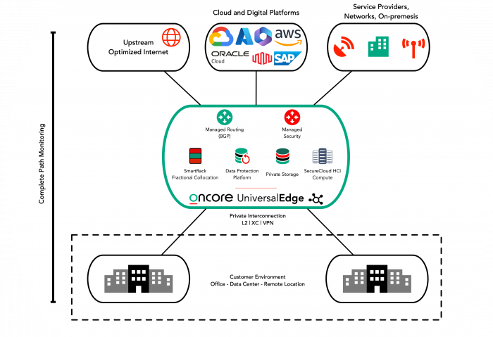 In today's digital landscape, connecting to digital and cloud platforms, Internet transit providers, as well as trusted third-party networks presents growing challenges and complexities. Enter Oncore's UniversalEdge — your direct highway to platforms, delivering fully managed, elastic, unified low-latency interconnections to your digital world.