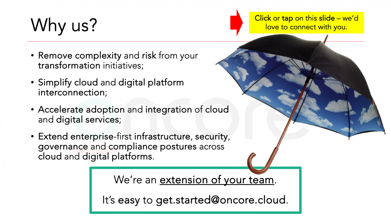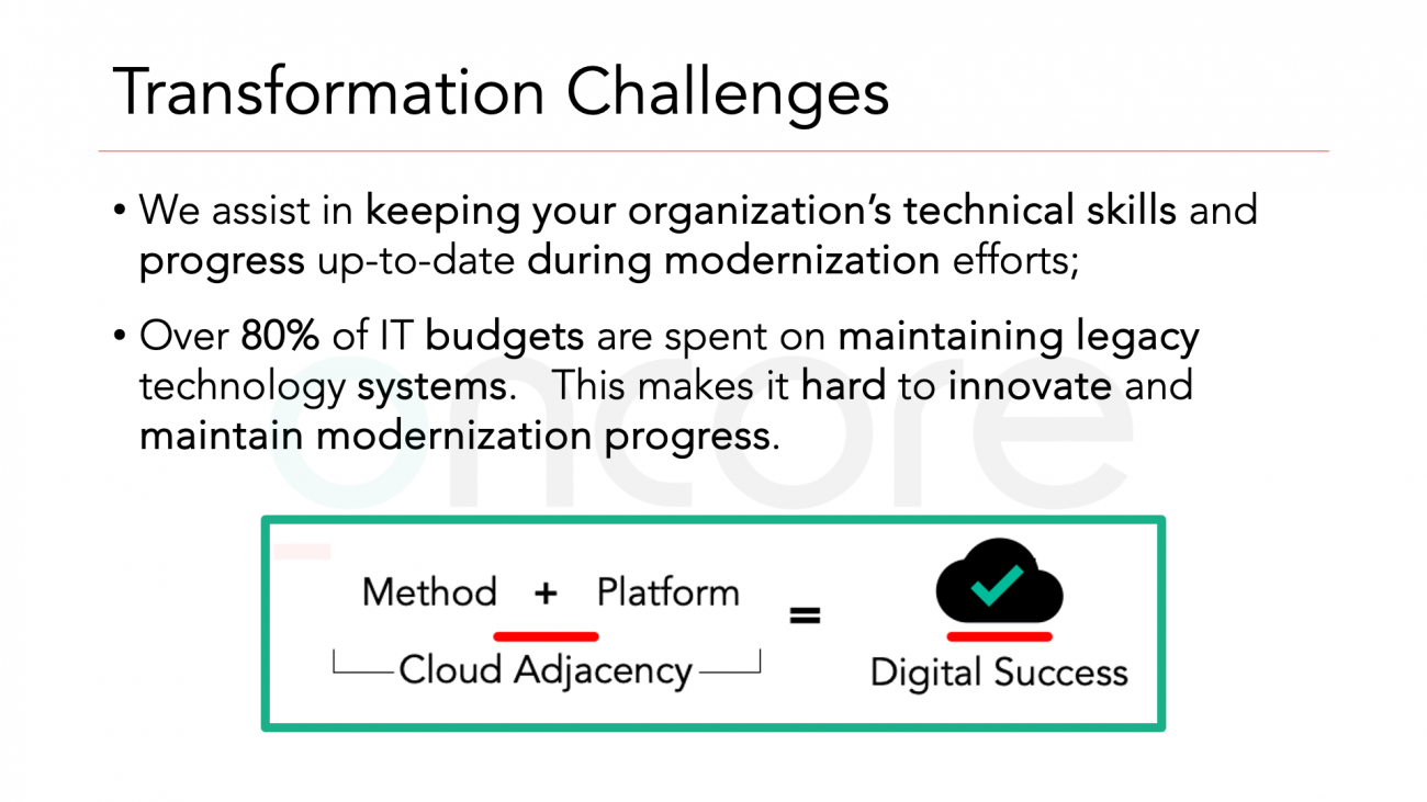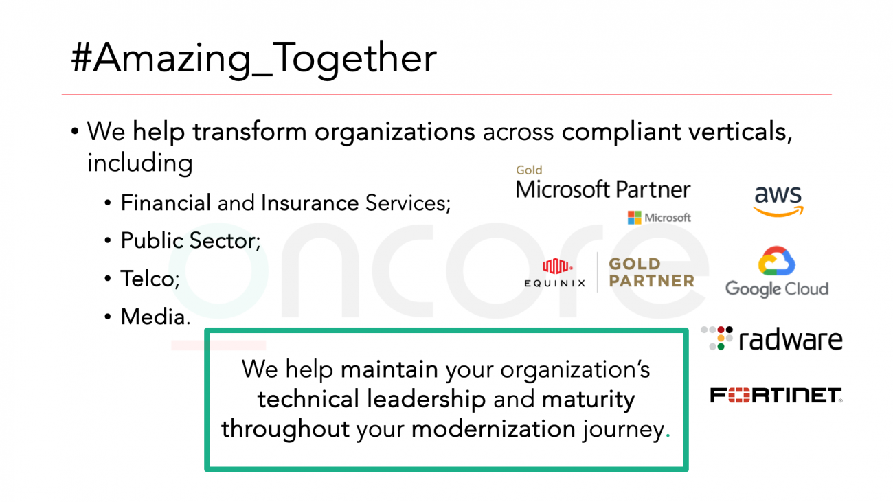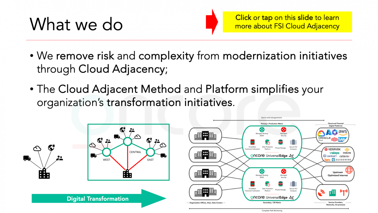 Oncore specializes in Cloud Adjacency — our innovative approach to hybrid technology solutions seamlessly bridging traditional and cloud environments. Digital leaders harness Oncore as a gateway to accelerating digital transformation and driving real results. Oncore delivers this through our integrated delivery of proven professional and managed technology services that aim to eliminate risk and complexity while boosting the velocity of technology initiatives.